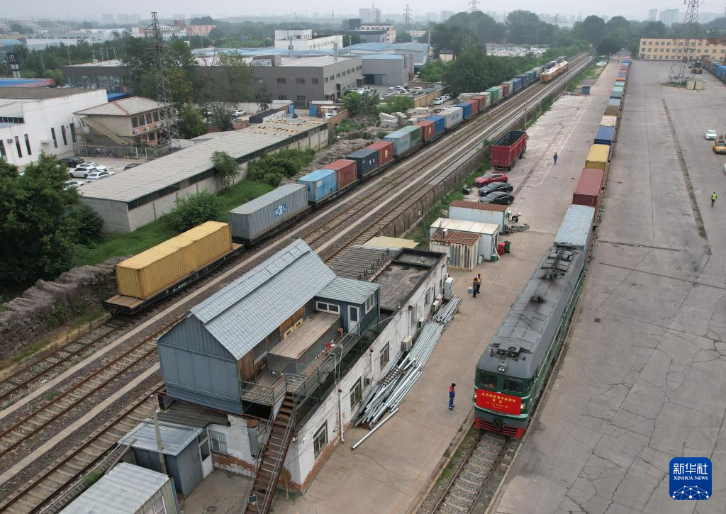 6月30日,北京至阿塞拜疆巴庫(kù)的跨里海中歐班列??吭谖挥诒本┦蟹可絽^(qū)的北京國(guó)際陸港等待發(fā)車(chē)(無(wú)人機(jī)照片)。