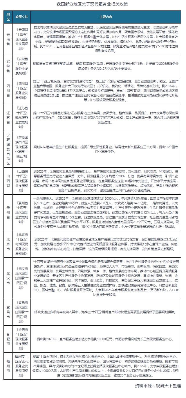 地方層面上,例如云南省發(fā)布的《云南省“十四五”現(xiàn)代服務(wù)業(yè)發(fā)展規(guī)劃》,提出將以推動現(xiàn)代服務(wù)業(yè)高質(zhì)量發(fā)展為主題,以深化服務(wù)業(yè)供給側(cè)結(jié)構(gòu)性改革為主線,以改革創(chuàng)新為根本動力,充分發(fā)揮市場配置資源的決定性作用和更好發(fā)揮政府作用,聚焦重點領(lǐng)域,優(yōu)化發(fā)展環(huán)境,強(qiáng)化數(shù)字賦能,增強(qiáng)要素保障,推動生產(chǎn)性服務(wù)業(yè)融合化發(fā)展,加快生活性服務(wù)業(yè)品質(zhì)化發(fā)展,擴(kuò)大服務(wù)業(yè)有效供給,提高服務(wù)效率和服務(wù)品質(zhì),構(gòu)建特色鮮明、優(yōu)質(zhì)高效、結(jié)構(gòu)優(yōu)化、競爭力強(qiáng)的現(xiàn)代服務(wù)產(chǎn)業(yè)新體系。到2025年,云南省服務(wù)業(yè)增加值占全省GDP的比重、服務(wù)業(yè)對經(jīng)濟(jì)增長的貢獻(xiàn)率“兩個50%”的地位將得到有效鞏固。
