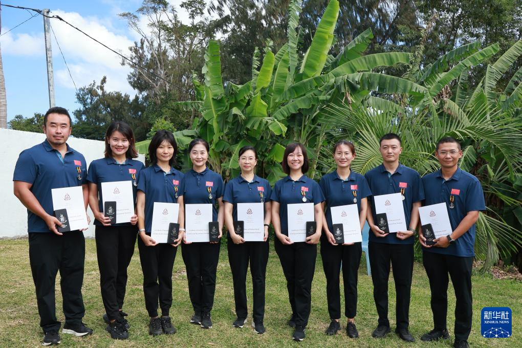 7月30日,在瓦努阿圖首都維拉港,中國援瓦醫(yī)療隊隊員手持證書合影。