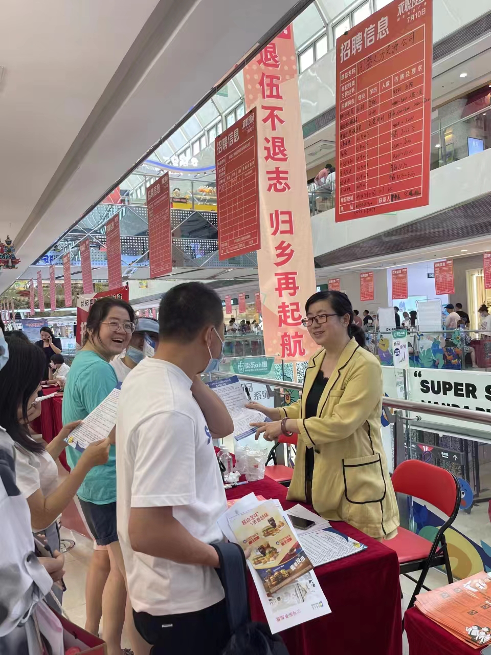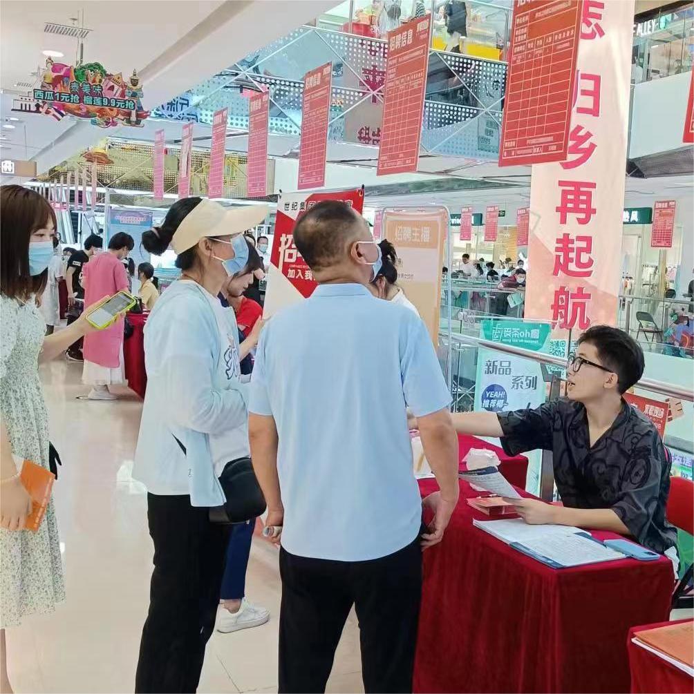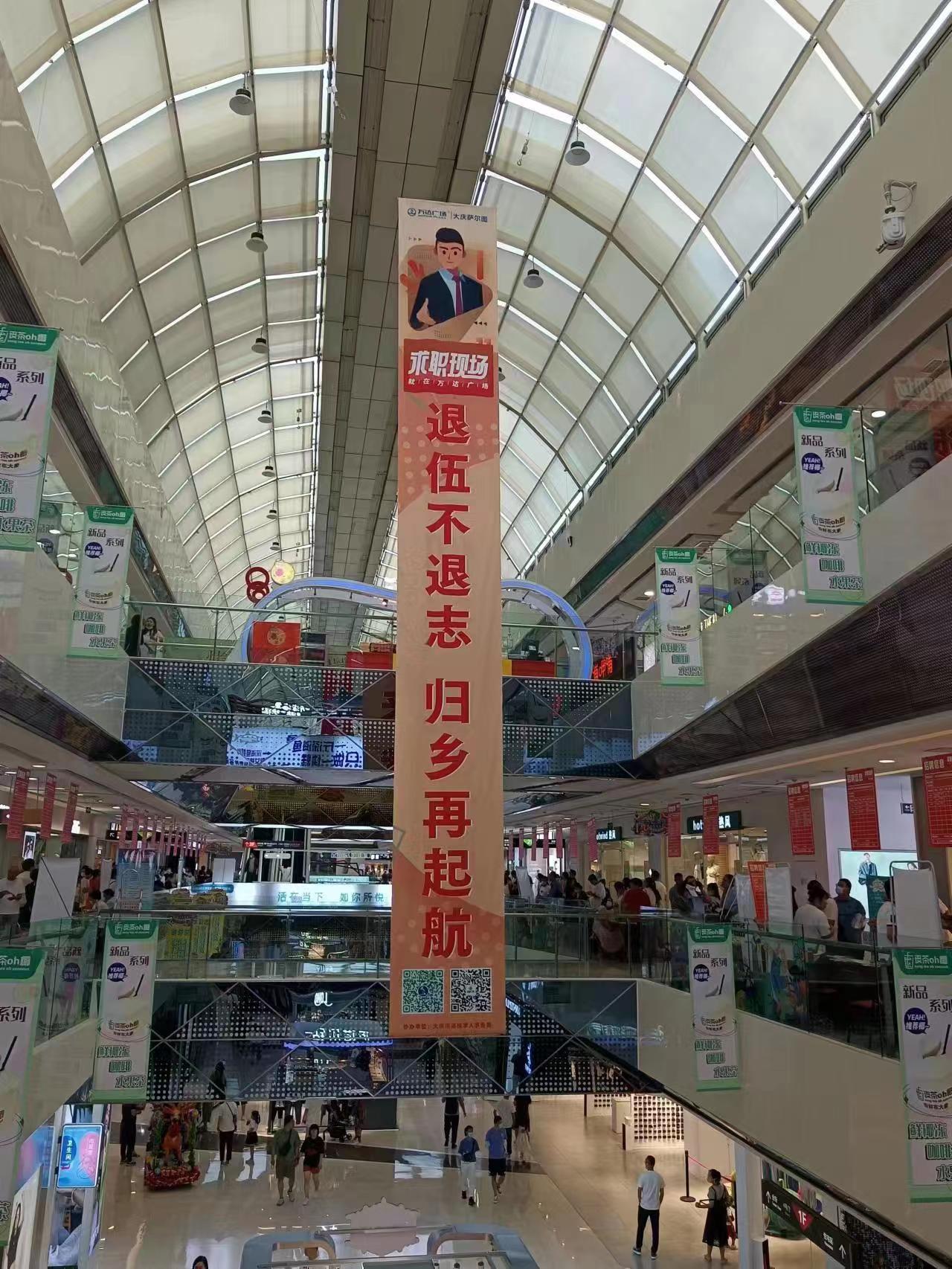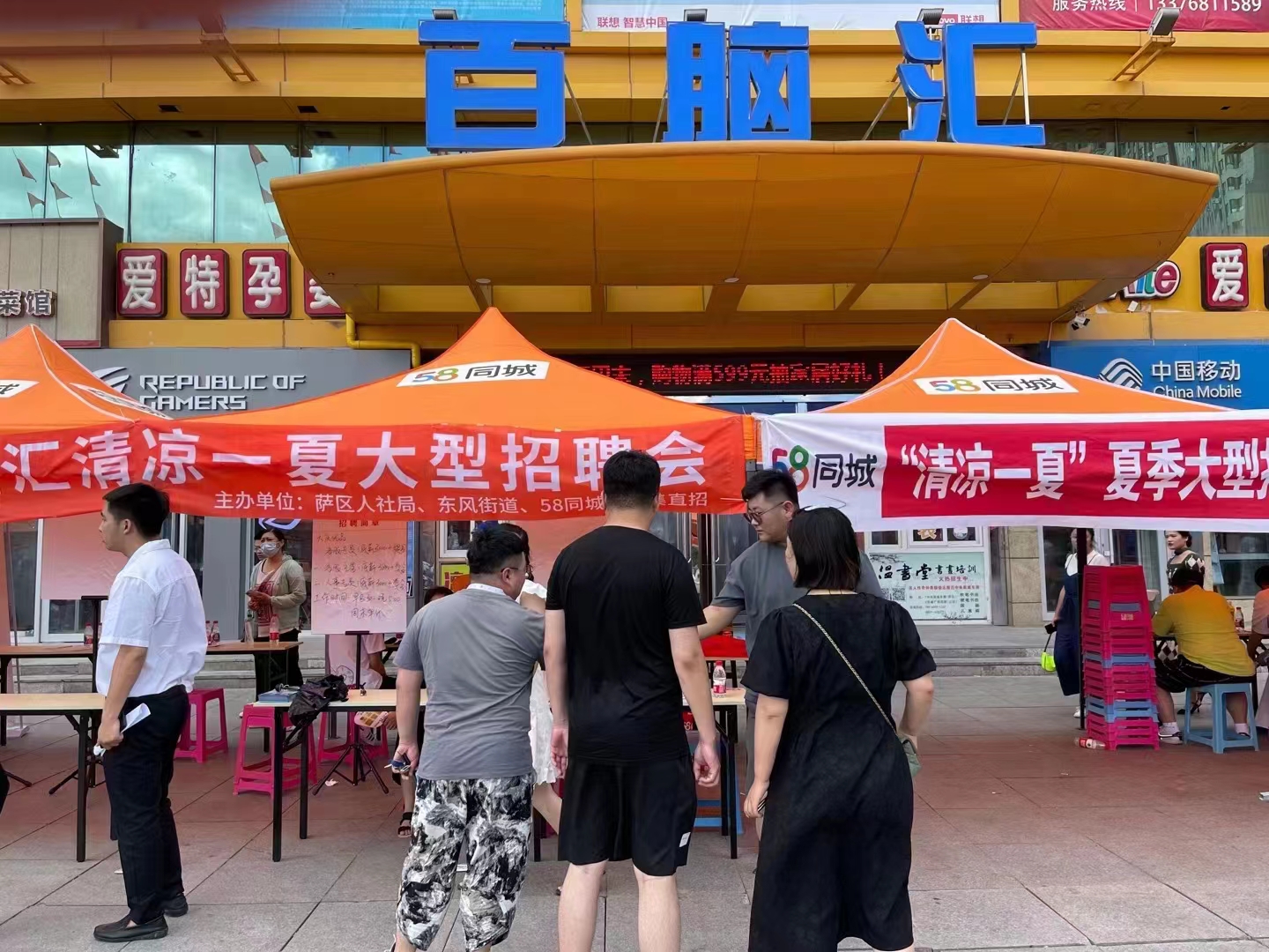7月10日上午,新村萬達休閑廣場人流如潮。大慶市人社局和五八同城聯(lián)合舉辦的“清涼一夏”大型招聘會萬達專場如火如荼進行。